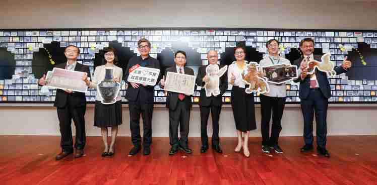 开云电子携手创利空间为故宫建置的智慧文物互动导览墙及轮播墙,,,,今日正式启用。。。。(左四:开云电子新事业暨投资管理总部副总经理杨本豫、、右四:故宫博物院院长吴密察、、右三:太极影音董事长黄宝云)